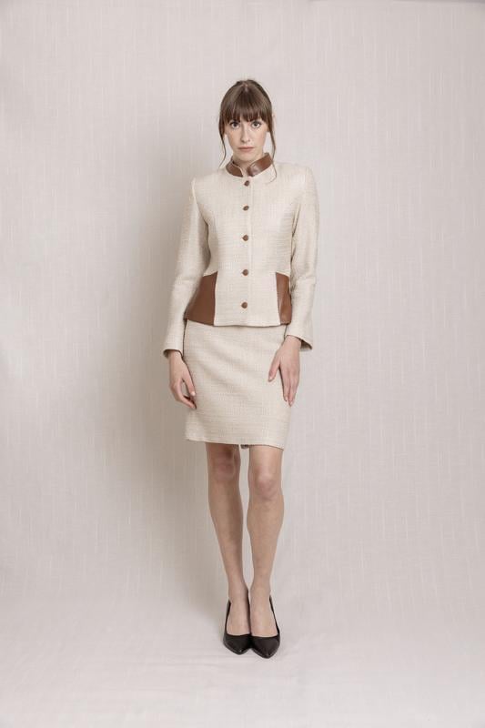 Tweed kumaştan üretilmiştir. Takımın he üst hem de altı astarlıdır. Etek, yırtmaçlı kalem etek kesimlidir.